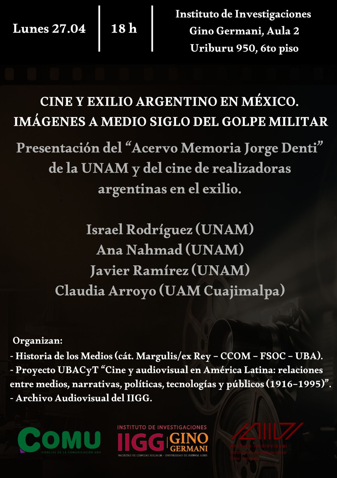 El encuentro, titulado “Cine y exilio argentino en México. Imágenes a medio siglo del golpe militar”, tendrá lugar el próximo 27 de abril a las 18 hs en el Aula 2 del Instituto de Investigaciones Gino Germani (Presidente J. E. Uriburu 950, 6º piso).