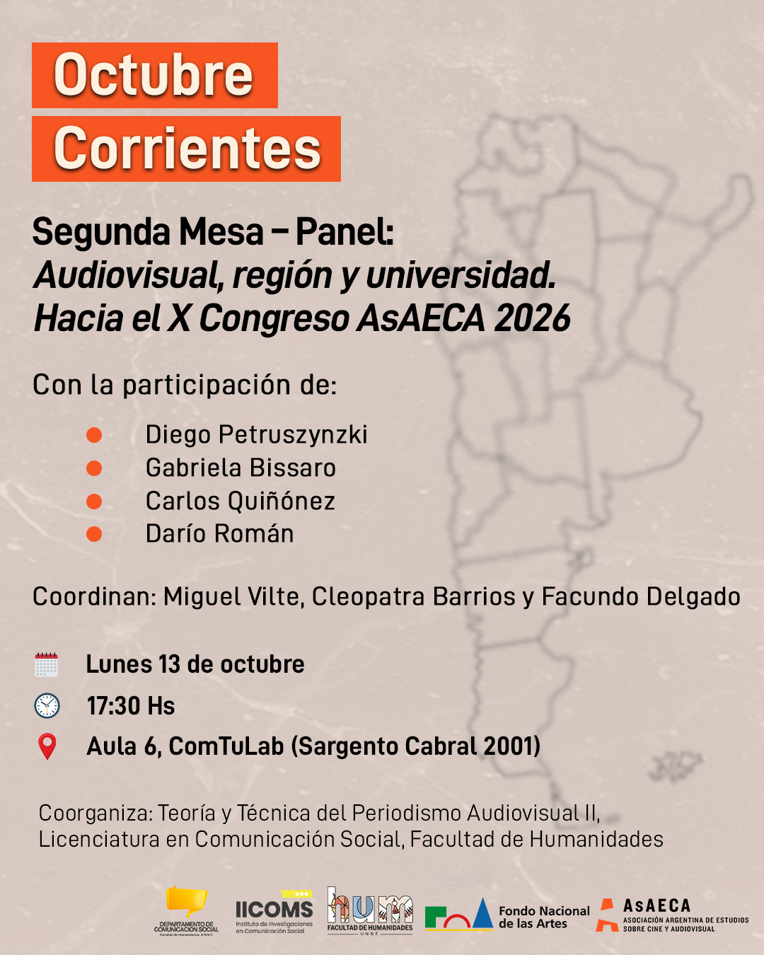 El cuarto encuentro será una segunda Mesa – Panel «Audiovisual, región y universidad. Hacia el X Congreso AsAECA 2026» y se realizará en la ciudad de Corrientes. La actividad es coorganizada junto a Teoría y Técnica del Periodismo Audiovisual II, Licenciatura en Comunicación Social, Facultad de Humanidades, UNNE.