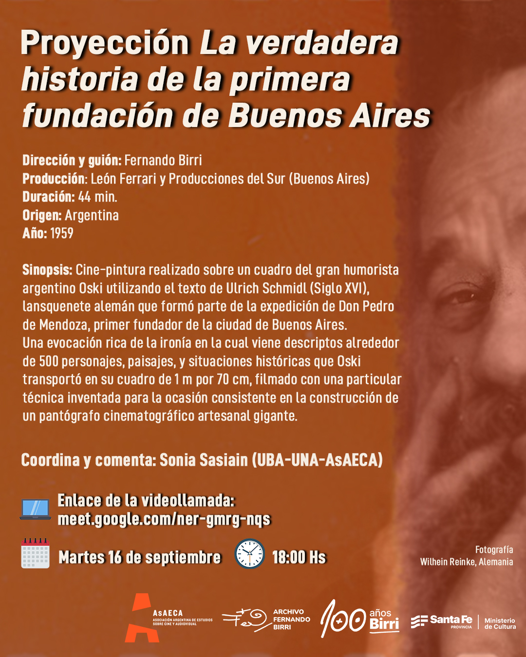 El martes 16 de septiembre a las 18:00 Hs. se llevará adelante el cuarto encuentro del ciclo con la exhibición del filme La verdadera historia de la primera fundación de Buenos Aires (1959), bajo coordinación de Sonia Sasiain (UBA – UNA – AsAECA). Se podrán conectar al encuentro a través del siguiente link: