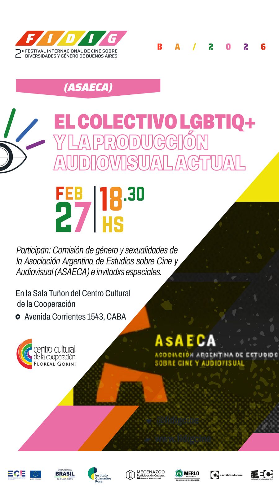 La Comisión de Géneros y Sexualidades de AsAECA estará participando como invitada del panel «El colectivo LGBTIQ+ y la producción audiovisual actual» en el marco del 2º Festival Internacional de Cine sobre Diversidades y Género de Buenos Aires (FIDiG) que se hará en el Centro Cultural de la Cooperación. Este festival tiene como objetivo principal fomentar la reflexión, el diálogo y la sensibilización en torno a las temáticas de diversidad y género a través del cine.