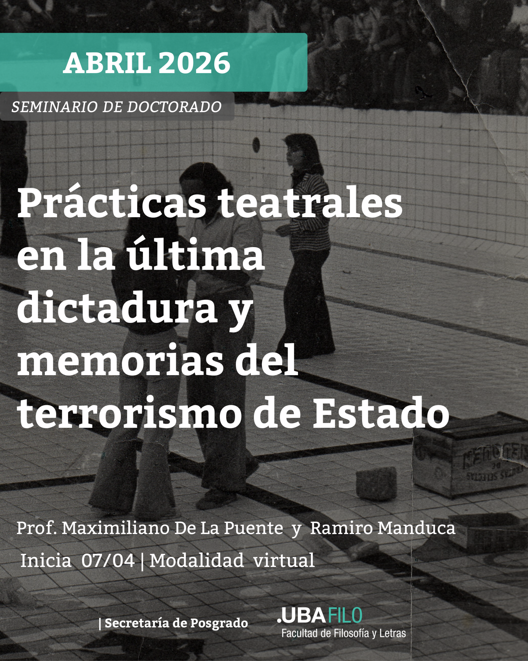 La Secretaria de Posgrado de FILO-UBA ofrece el seminario de doctorado «Prácticas teatrales en la última dictadura y memorias del terrorismo de Estado en producciones escénicas, performáticas y audiovisuales contemporáneas», dictado por Maximiliano De La Puente y Ramiro Manduca.